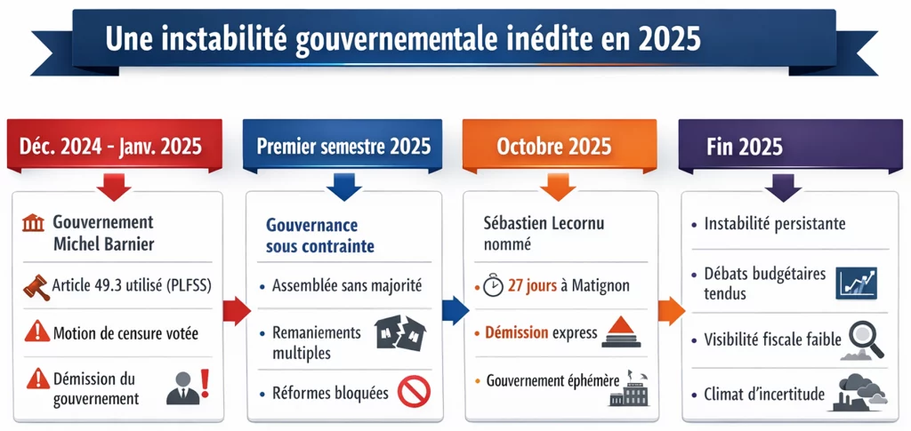 L’un des faits marquants de 2025 en France concerne l’instabilité politique qui a assombri le paysage institutionnel. Cette instabilité n’est pas un simple bruit de fond : elle a directement affecté la confiance des entreprises, les anticipations budgétaires et les décisions d’investissement.